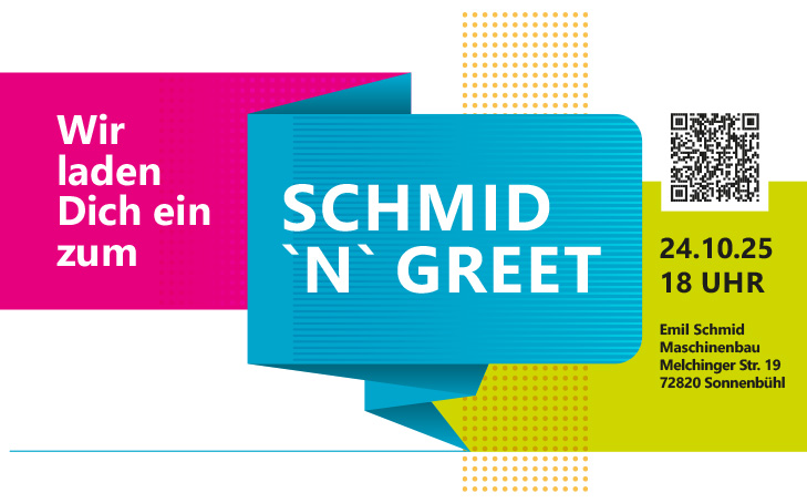 Auch in diesem Jahr findet wieder unser beliebtes SCHMID 'N' GREET statt. Herzliche Einladung dazu am 25.10.2024 um 18 Uhr bei EMIL SCHMID MASCHINENBAU.